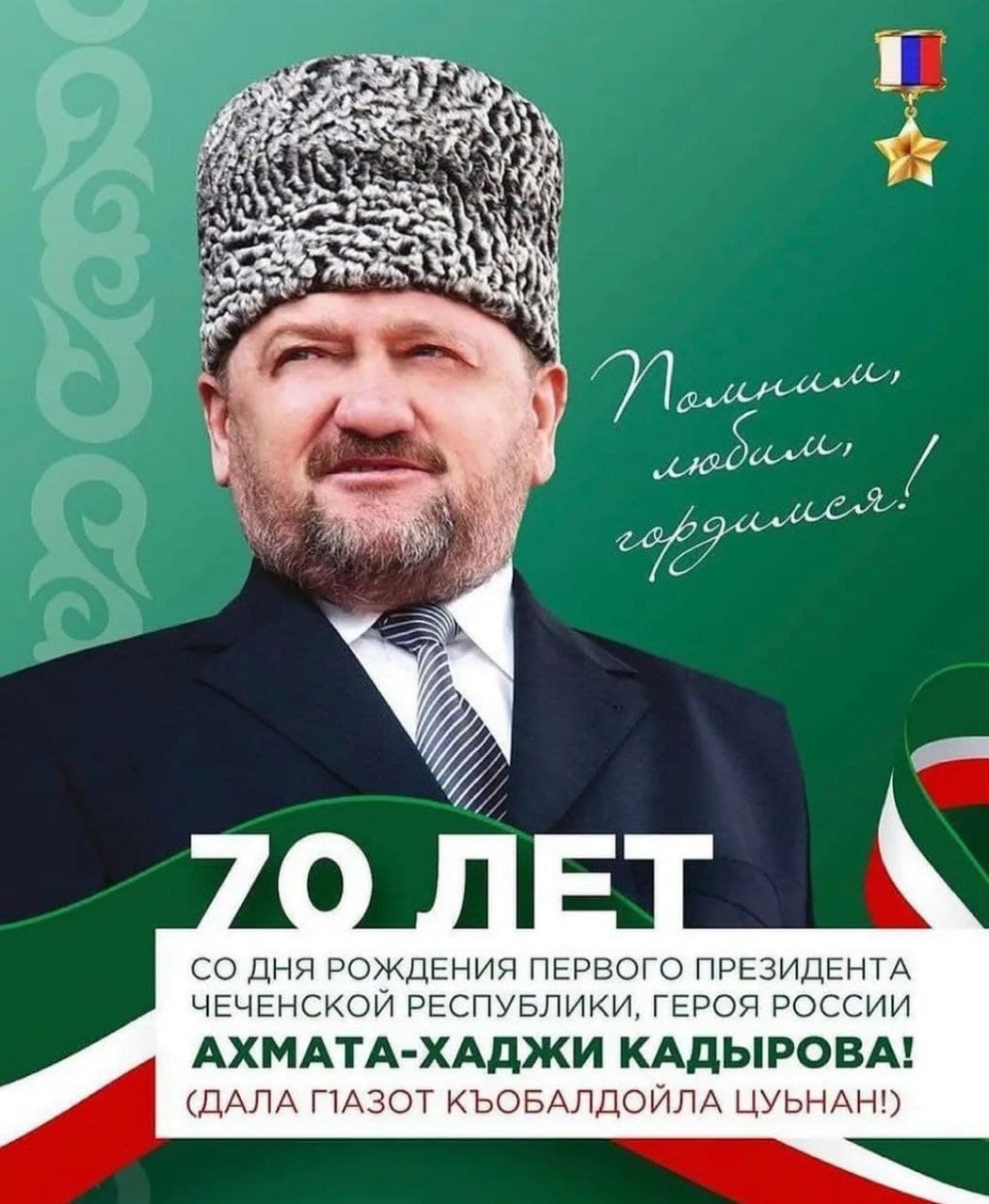 23.08.2021Сегодня исполнилось бы 70 лет выдающемуся религиозному и политическому деятелю современности, нашему Первому Президенту, Герою России Ахмат-Хаджи Кадырову (Дала гIазот къобал дойла цуьнан!). Мы со скорбью вспоминаем этого великого человека, достойного сына чеченского народа, чья воля, непоколебимость и любовь к своей Отчизне помогли спасти от страшных войн наш народ.